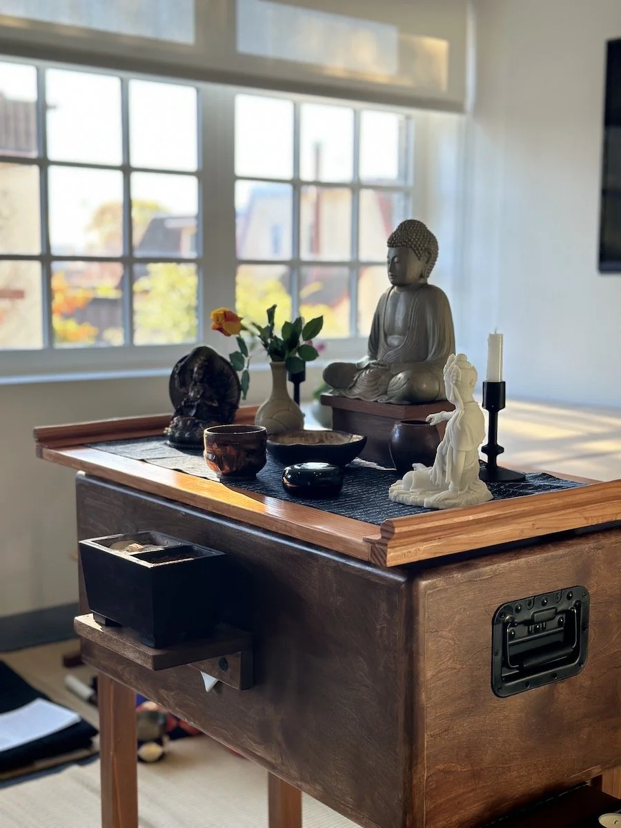 Therefore, even if only one person sits for a short time, because this zazen is one with all existence and completely permeates all time, it performs everlasting buddha guidance within the inexhaustible dharma world in the past, present and future. (Zazen) is equally the same practice and the same enlightenment for both the person sitting and for all dharmas. The melodious sound continues to resonate as it echoes, not only during sitting practice, but before and after striking sunyata, which continues endlessly before and after a hammer hits it. “ Master Dogen’s Zazen Meditation Handbook, translated by Shohaku Okumura and Taigen Dan Leighton